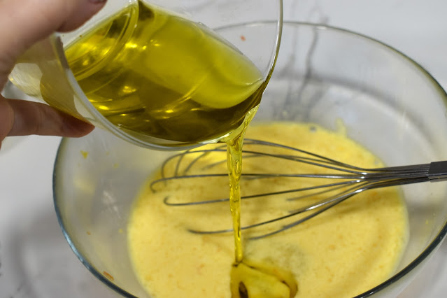 En un bol grande ponemos los huevos y rallamos la media naranja y el medio limón que tenemos reservado y batimos.