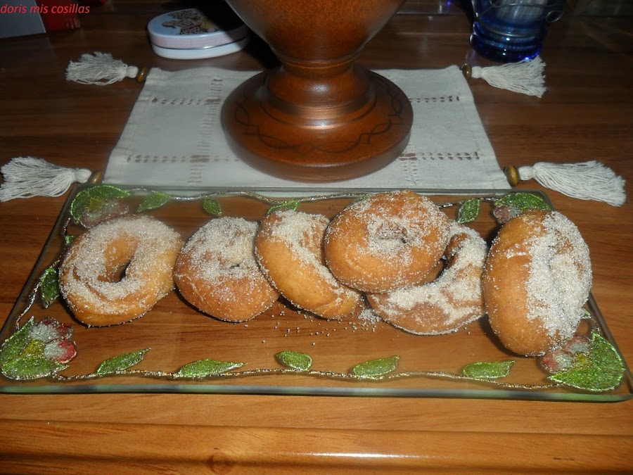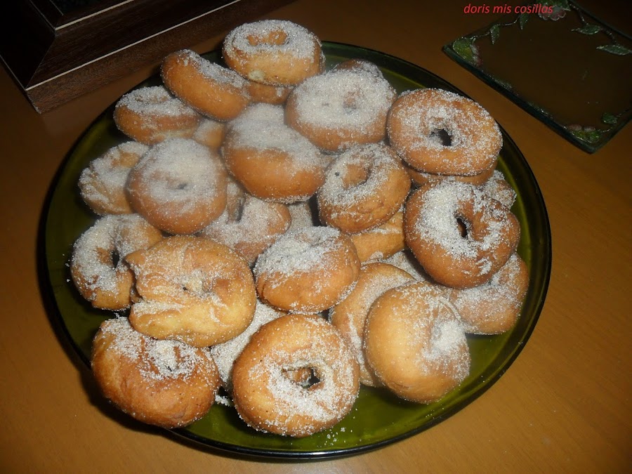 Ponemos en una cazuela profunda aceite de girasol con una corteza de limón y cuando esté caliente nos untamos el dedo índice de harina y vamos haciendo un hoyo en el centro de cada bolita de masa, y formen los roscos .Vamos friéndolos por tandas pequeñas, damos la vuelta para dorarlos por los dos lados, retiramos sobre papel absorbente y rebozamos en una mezcla de azúcar y canela o solo azúcar, va en gusto y ya tenemos nuestros roscos de anís de Semana Santa y a disfrutarlos.