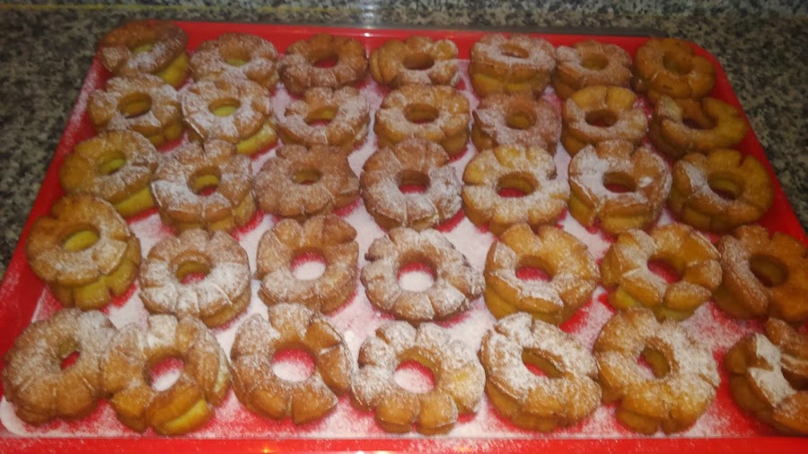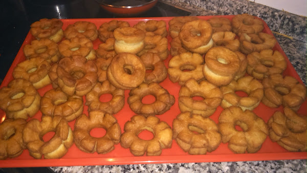 La temperatura del aceite no debe estar muy fuerte,más bien vajita, pues sino los roscos enseguida se doran por fuera pero se quedan crudos por dentro y no esponjan.