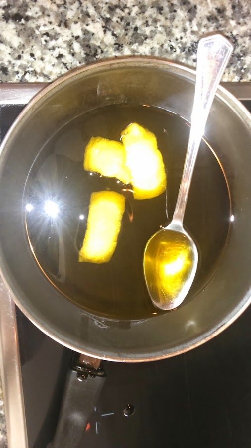 Empezaremos poniendo el aceite a calentar a fuego lento con las cortezas del limón,cuando empiece a humear lo apartamos dejamos enfriar y lo reservamos,