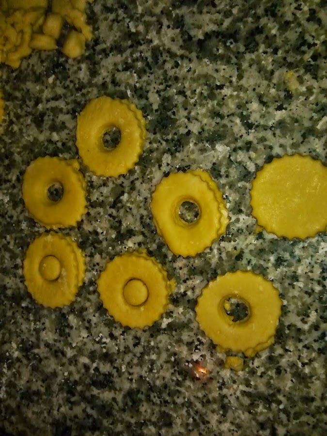 Vamos poniendo uno encima de otro, cuando los tenemos de dos en dos volvemos a recortar en el centro con un molde más pequeño,esto hará que quede pegado por el centro.Con la masa que retiramos volvemos a hacer lo mismo y así mientras que nos quede masa