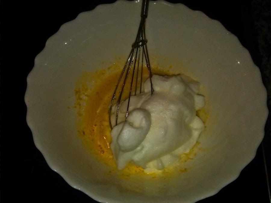 Las claras se baten hasta conseguir el punto de nieve y se echa a la mezcla de los otros ingredientes de forma suave con movimientos envolventes para que las claras no se nos bajen demasiado