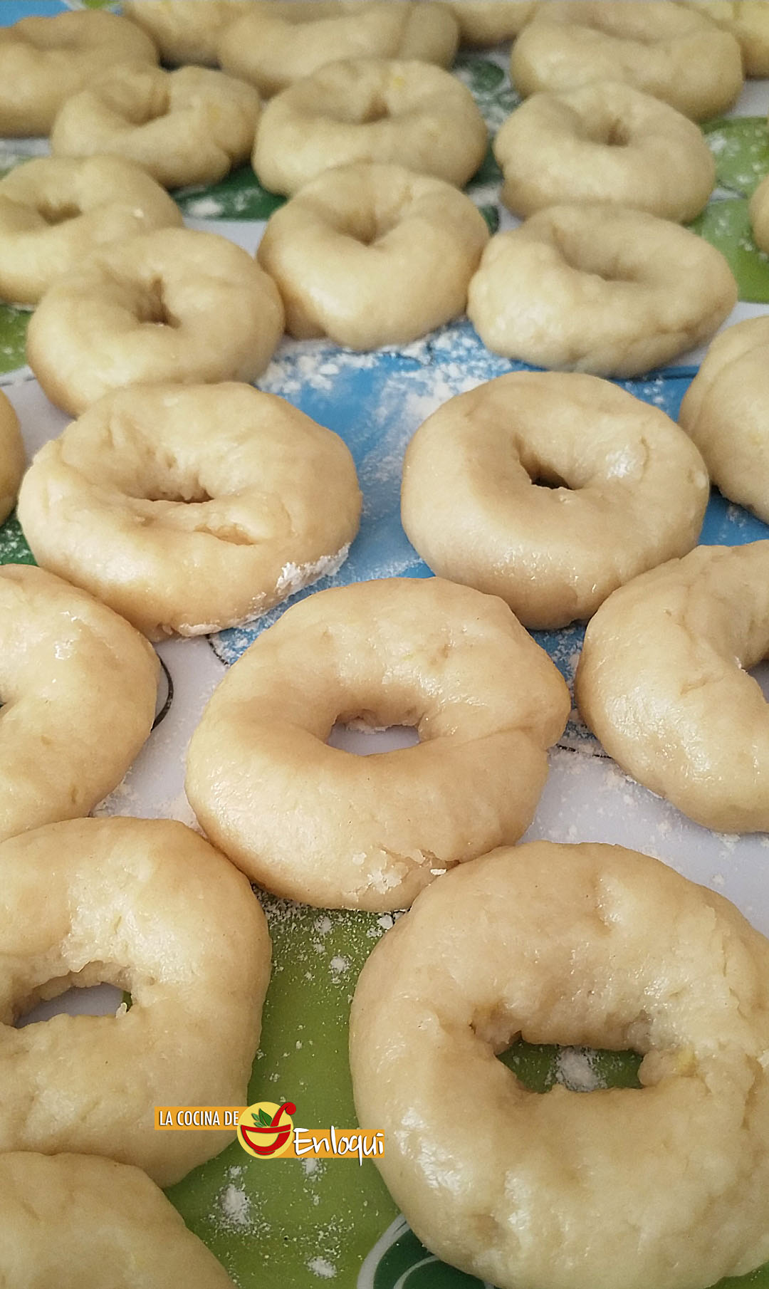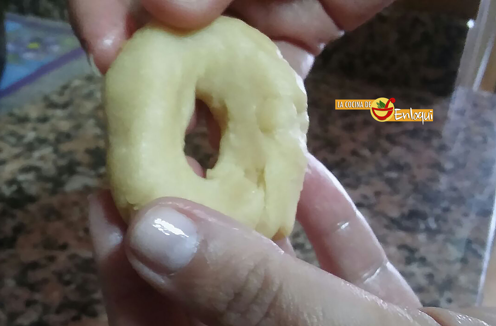 Nota: La masa se puede dejar reposar media hora antes de freír para que la levadura fermente, pero no es necesario porque al freír verás cómo los roscos se ponen gorditos.
