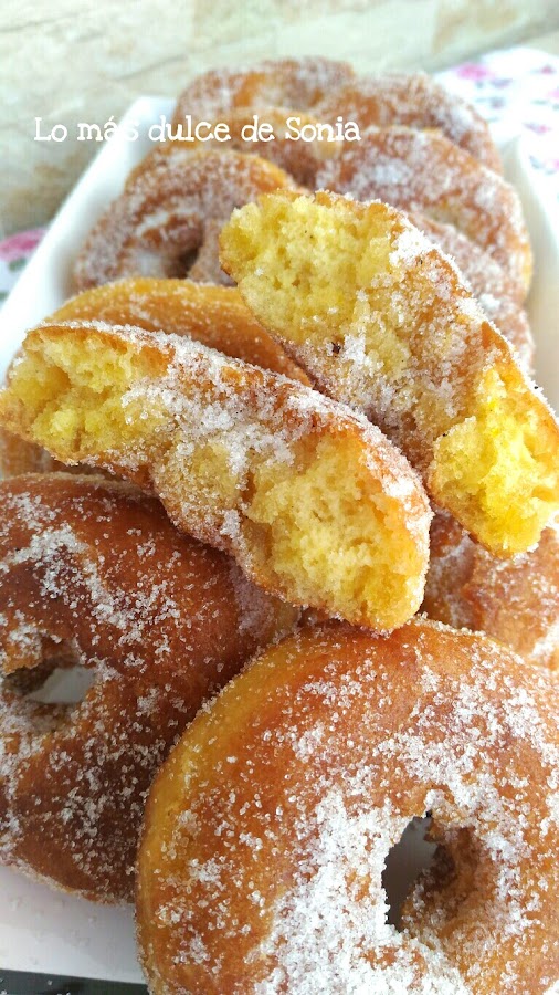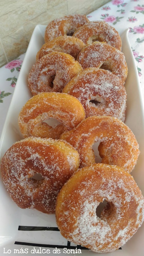 Freimos por ambos lados a fuego medio y cuando los roscos estén doraditos sacamos de la sartén y dejamos sobre una bandeja con papel de cocina para que escurra el aceite e inmediatamente pasamos por azúcar y canela. Debe de ser con los roscos calientes, porque si se enfrían el azúcar no se les pegará.