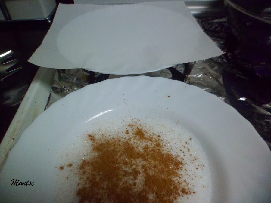 Tendremos preparado un plato con papel de cocina y otro con el azúcar y la canela.