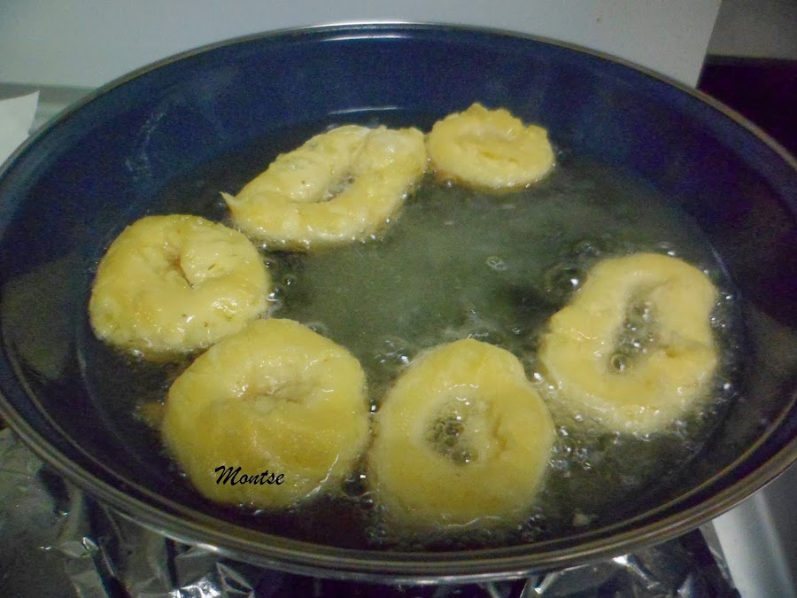 Prepararemos una sartén con abundante aceite, cuando esté caliente iremos cogiendo bolas y haremos la forma del rosco y lo echaremos a la sartén.