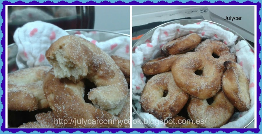 Poner todos los ingredientes en la panificadora, programa nº 7 amasado rapido (15 minutos), una vez amasado dejar reposar dentro 30 minutos, pasado ese tiempo, sacar la masa, es muy manejable, yo he cojido porciones de 50gr cada una y le he dado forma de rosco, los he horneado en el horno turbo convección, he puesto la rejilla y papel de hornear encima, he puesto 7 rollos, hornear 10 minutos, 175º, dar la vuelta y 8 minutos, 175º, asi hasta terminar todos, (tienen que estar doraditos por ambos lados) cuando estan, los sacamos espolvoreamos con azúcar aromatizada y dejamos enfriar, al princio estan blanditos, pero cuando se enfrian se endurecen y estan ñamñam