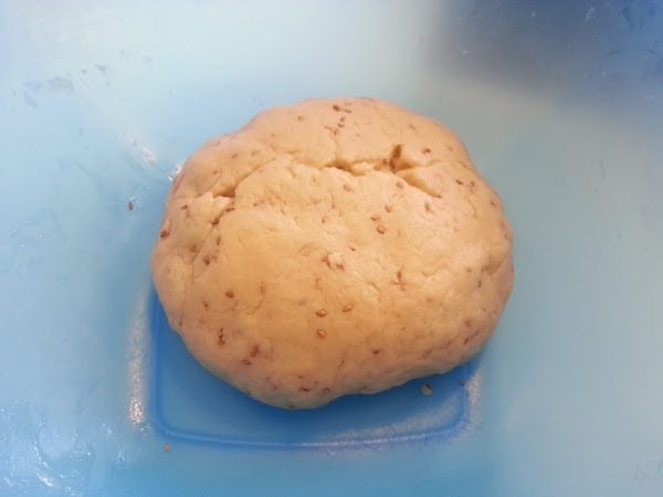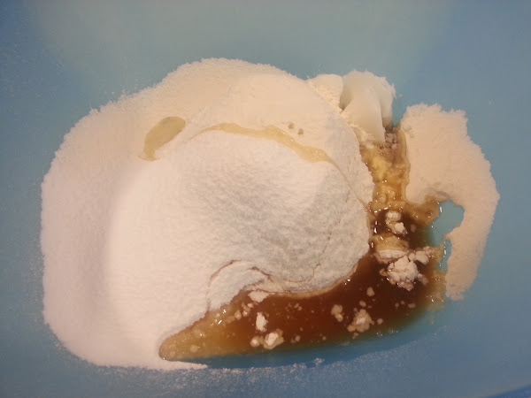2. - Pasamos la harina por un colador , lo que se llama tamizar, y lo echamos en un bol junto con la manteca, el vino dulce, el azúcar glas, el anís y el aceite con el sésamo ya templado.
