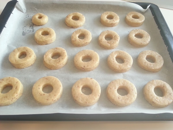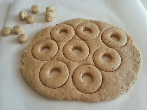 6. - Con los recortes volvemos a amasar y volvemos a estirar, y seguimos haciendo roscos, hasta terminar con la masa.