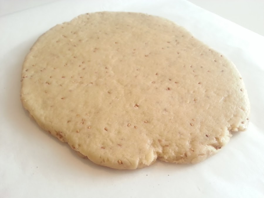 4. - Extendemos la masa con un rodillo sobre la encimera o papel de horno hasta que tenga un grosor de medio centímetro.
