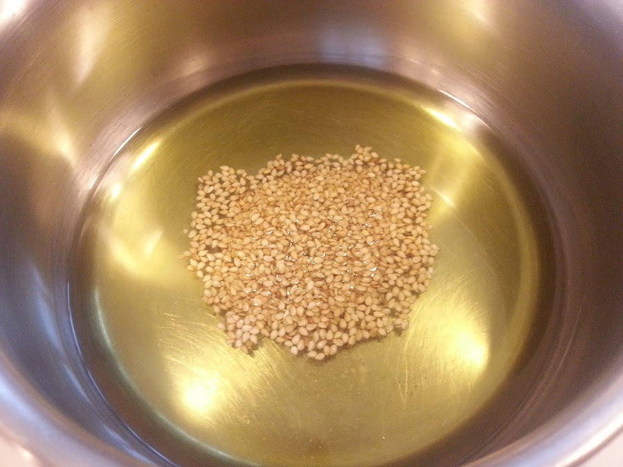1. - Ponemos en un cazo el aceite de oliva con el sésamo o ajonjolí y calentamos hasta que las semillas desprendan su aroma,el aceite no debe hervir.