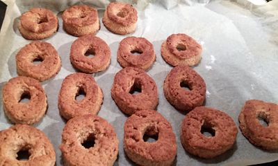 Con un molde redondo vamos cortando los rosquillos y el centro, si no tienes descorazonador de manzanas, puedes usar un tapón del tetrabrik de leche.