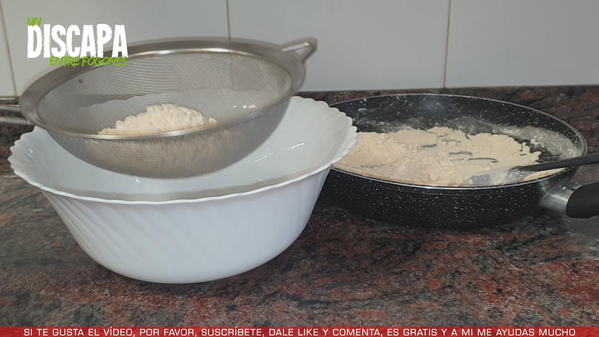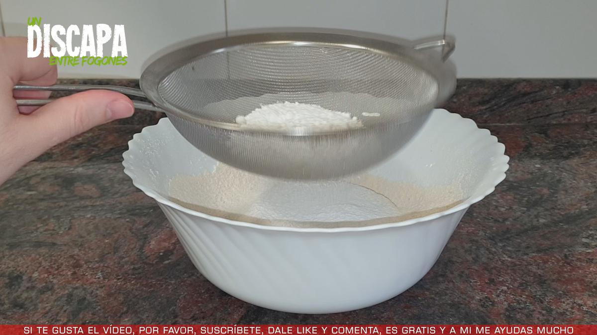 2A continuación añadimos la harina en un colador y procedemos a tamizarla para deshacernos de los grumos.