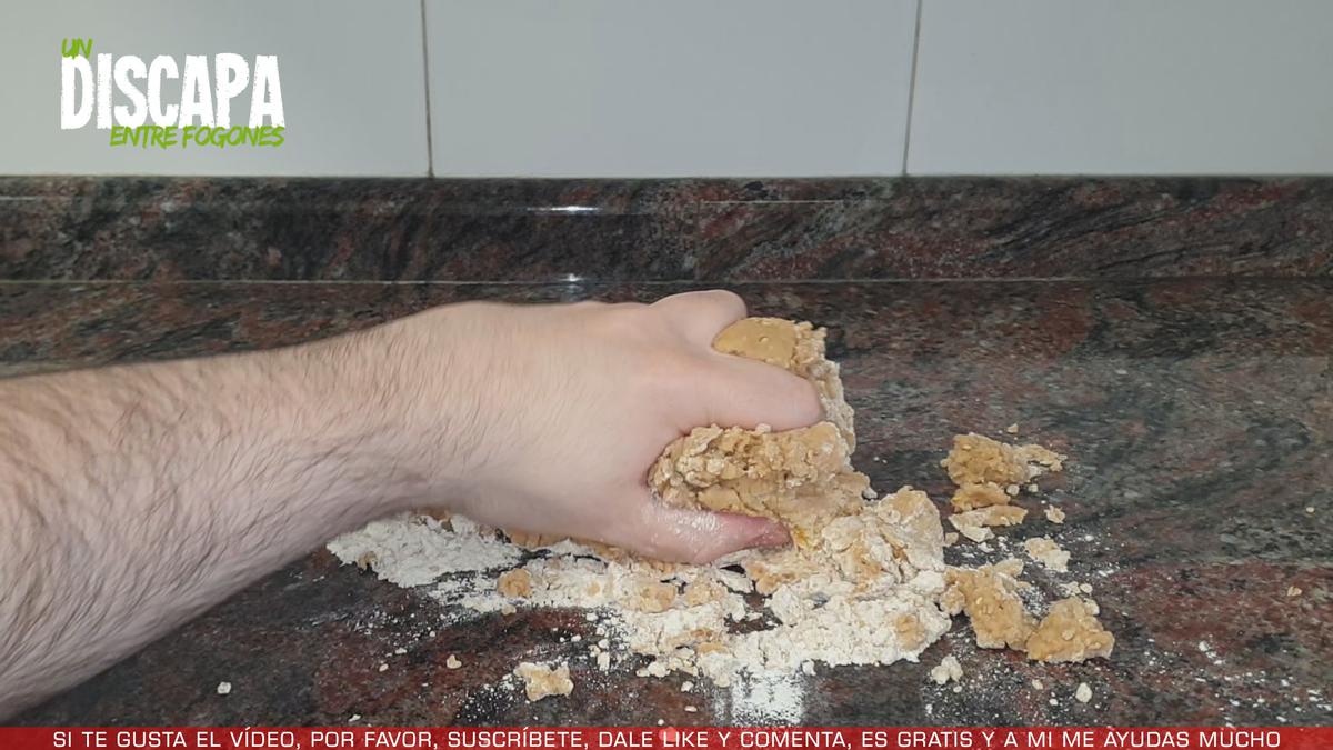 Y después añadimos la masa a la superficie de trabajo y con las manos bien limpias lo amasamos.
