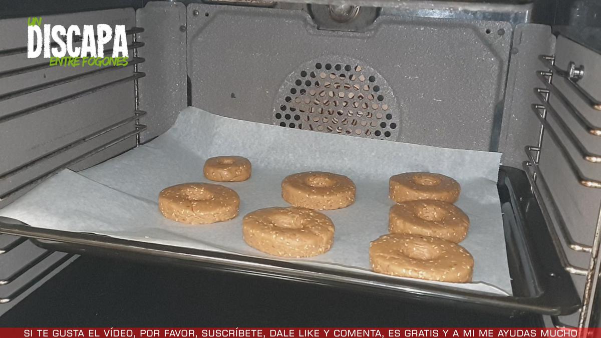 7Después, con cuidado, llevamos los roscos a una bandeja de horno y con el horno previamente precalentado los metemos durante unos 12 o 15 minutos a 180º centígrados.