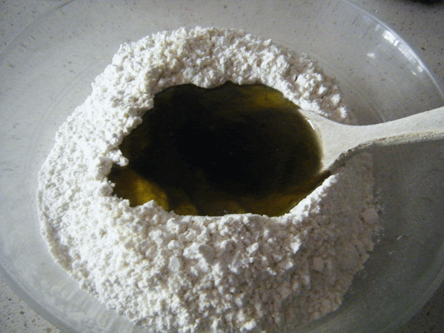 En un bol vertemos la harina, hacemos un hueco y añadimos el aceite que ya estará frío, removiendo bien con una cuchara de madera.