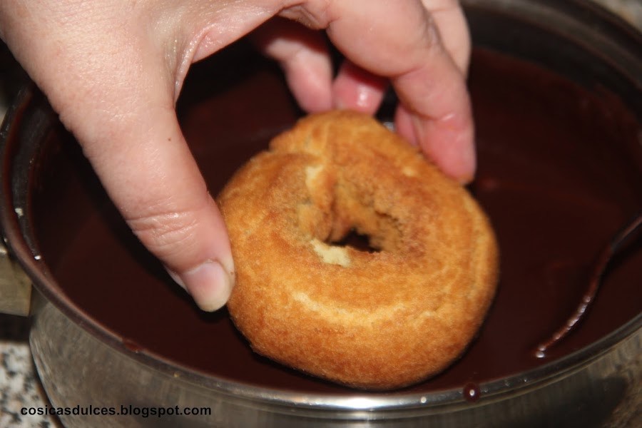 Preparamos el glaseado. Para ello hacemos un almíbar. Cuando el azúcar esté totalmente disuelto añadimos, fuera del fuego, el chocolate troceado. Cuando tengamos una mezcla homogénea bañamos en ella los roscos.