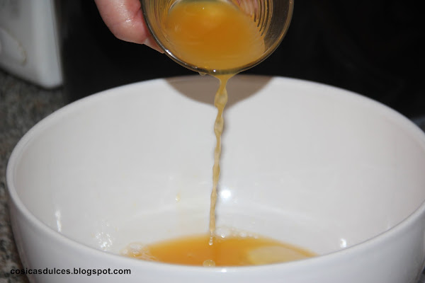 Ponemos en un bol los huevos, el aceite, el zumo de naranja y el bicarbonato. Mezclamos bien.