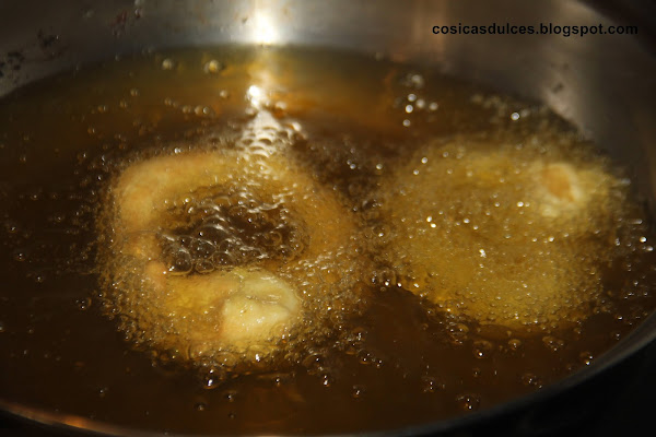 Dejamos reposar la masa durante 30 minutos. Pasado ese tiempo nos mojamos las manos en aceite (de forma abundante) y vamos formando los roscos. La masa es muy blanda y pegajosa pero si tenemos las manos con aceite lograremos hacerlos. Un detalle importante es que según formamos los roscos debemos echarlos al aceite de freir (si los ponemos sobre una superficie antes de freirlos luego será imposible volver a cogerlos). Otro dato importante es la temperatura del aceite: debe estar caliente pero suave de lo contrario se quedarán crudos por dentro.