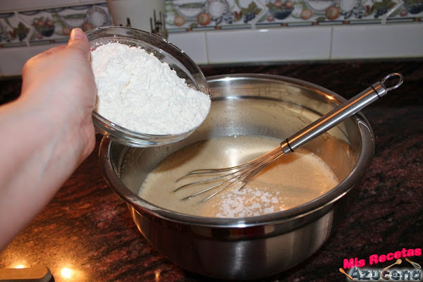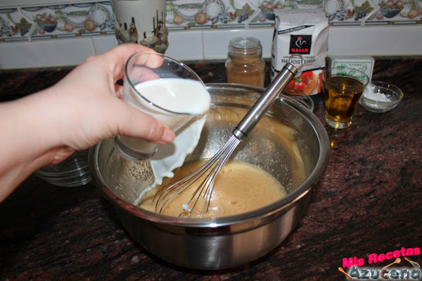 Cogemos un bol y cascamos todos los huevos, con ayuda de unas varillas los mezclamos bien, añadimos el azúcar y la leche, seguiremos mezclando hasta que se disuelva el azúcar.