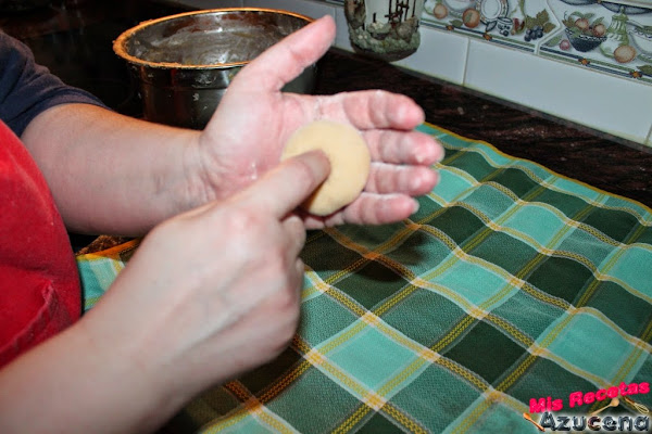 Cuando tengamos la bola de masa del tamaño deseado y bien redondeada con ayuda de un dedo le haremos un agujero en el centro y lo abriremos un poco, lo dejaremos sobre un mantel mientras preparamos unos cuantos para empezar a freír.