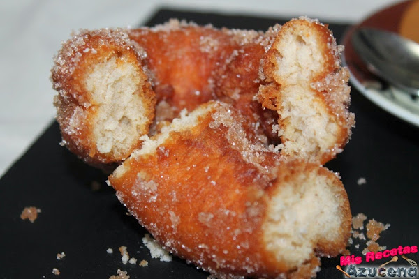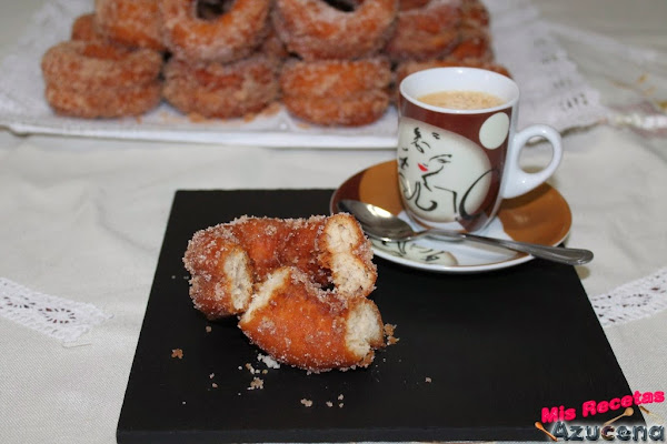 Ya tenemos todo listo ahora cogemos un rosco lo introducimos en el bol con el líquido y después lo de pondremos sobre el azúcar le damos vueltas por todas partes y con ayuda de las manos le ponemos un poco por el centro y lo colocamos en una bandeja.