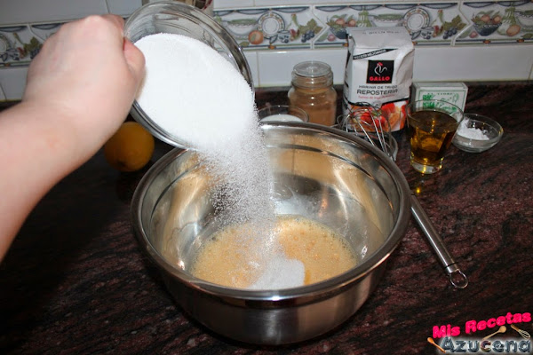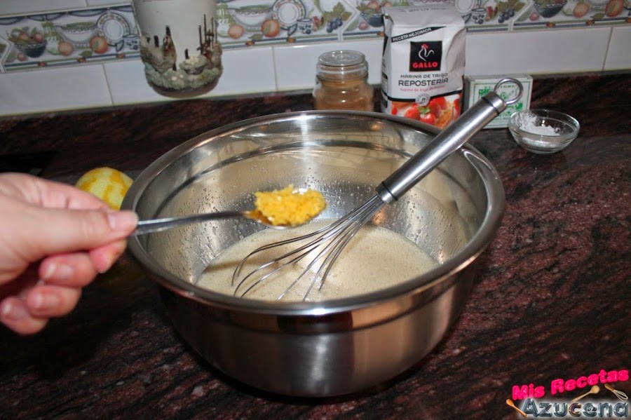 Una vez tengamos el azúcar y la leche bien mezclados añadiremos el aceite, la ralladura de limón, la canela y el jugo de medio limón, volvemos a mezclarlo todo bien.