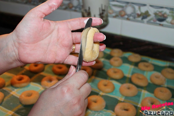 A la hora de freírlos solo nos falta hacerle el centro al rosco, para ello cogemos un cuchillo y con la parte que no corta le daremos forma por todo el centro de la parte exterior apretando con él cuchillo, una vez lo tengamos marcado lo ponemos a freír y cogemos otro rosco para hacer el mismo procedimiento.