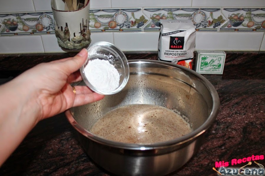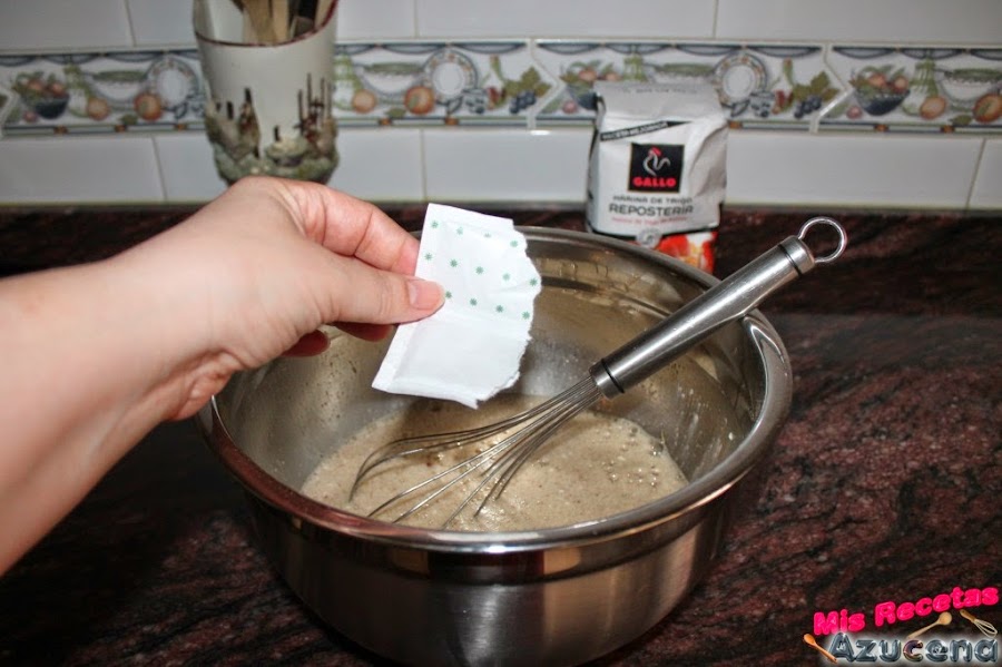 Cuando tengamos todo bien mezclado añadiremos la levadura y los sobres de gaseosa, volvemos a mezclar para que se disuelva bien.