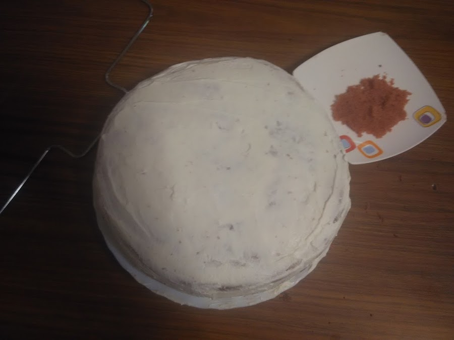 Ahora solo quedaría poner la masa en el molde que se quiera utilizar (previamente cubierto con mantequilla y harina) e introducir en el horno a 150 ºC durante 40 minutos. Como el horneado depende muchísimo del horno, lo más recomendable es emplear un palillo. Para ello debemos pinchar de vez en cuando el bizcocho hasta que veamos que el palillo sale completamente seco, momento en el que la masa ya estará cocinada. Se deja reposar el bizcocho 10 minutos, se desmolda y deja reposar encima de una rejilla hasta que se tenga el glaseado listo para montar la tarta.
