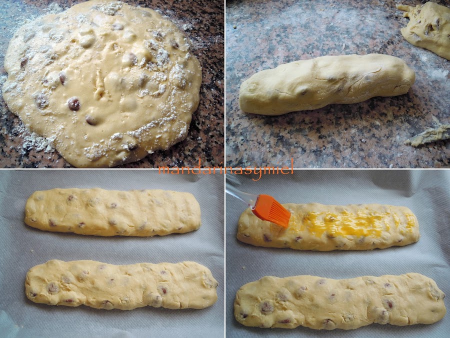 Forma con la masa dos rulos y aplástalos como si fueran barras de pan, deja espacio suficiente entre ellos porque luego crecen en el horno.