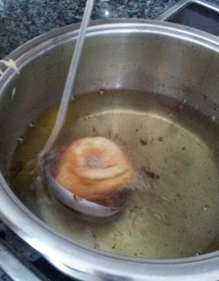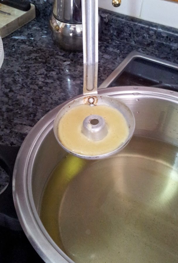 Sumergir el candil en el aceite caliente y vamos llenando hasta la mitad. Os podéis ayudar bien con una cuchara sopera o con una jarra, es mucho más cómodo la jarrita, el molde siempre caliente y cuando doren las rosquillas las pasamos a un plato con papel absorbente y las vamos envolviendo en azúcar. Ya tenemos nuestras rosquillas de candil, una autentica delicia.