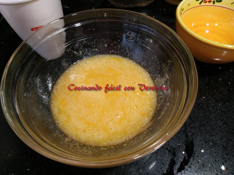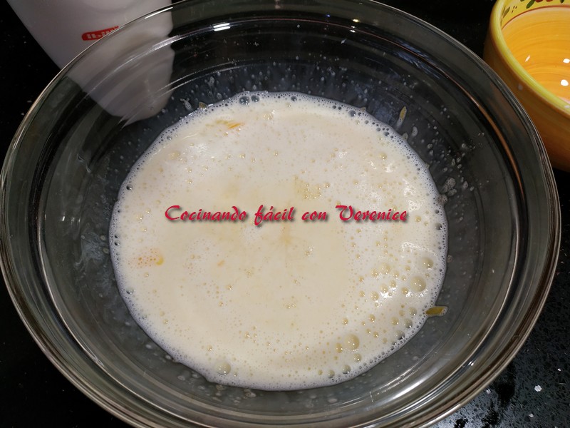 Le incorporamos la leche, el zumo de naranja y seguimos batiendo de nuevo.