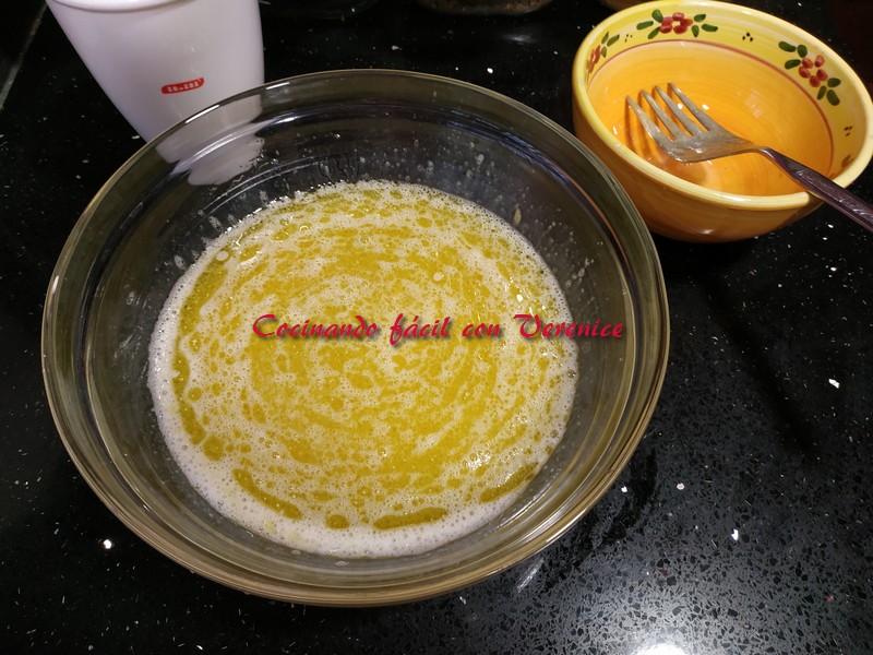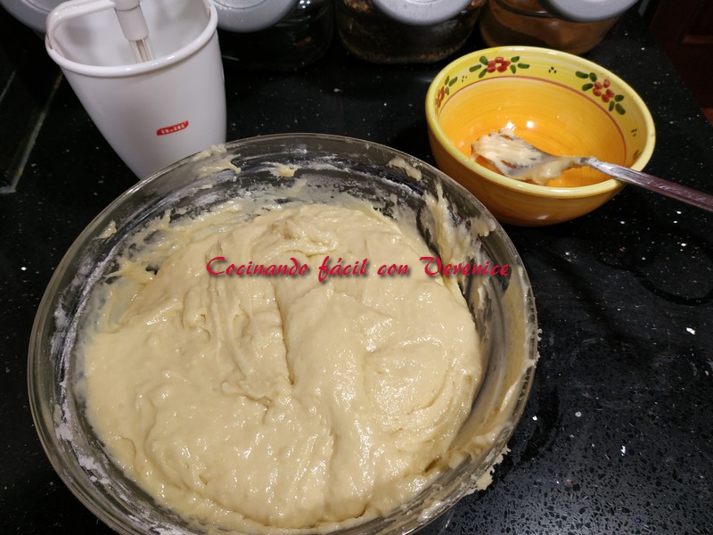 Por último añadimos esta mezcla a los ingredientes del bol, poco a poco y mezclando muy bien para no dejar grumos. Mejor batir manualmente porque la masa queda más esponjosa.