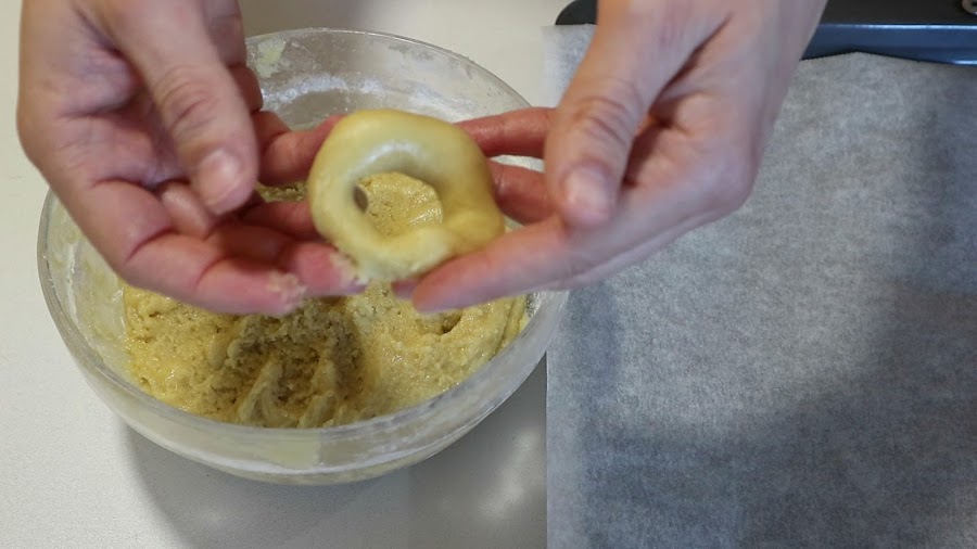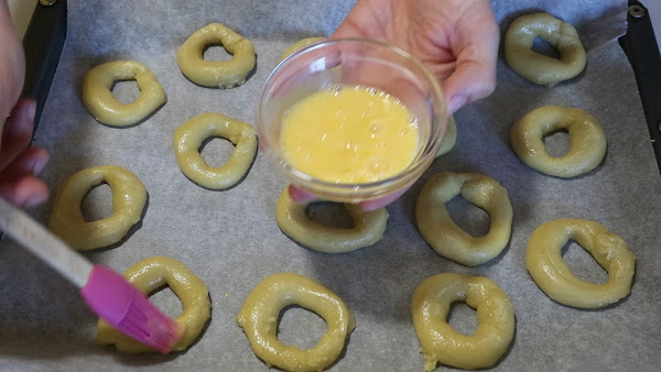 Ponemos las rosquillas sobre una plancha para hornear forrada de papel de hornear para que no se peguen. Ahora cogemos el otro huevo que teníamos reservado y lo batimos para pintar la superficie de las rosquillas con el huevo.