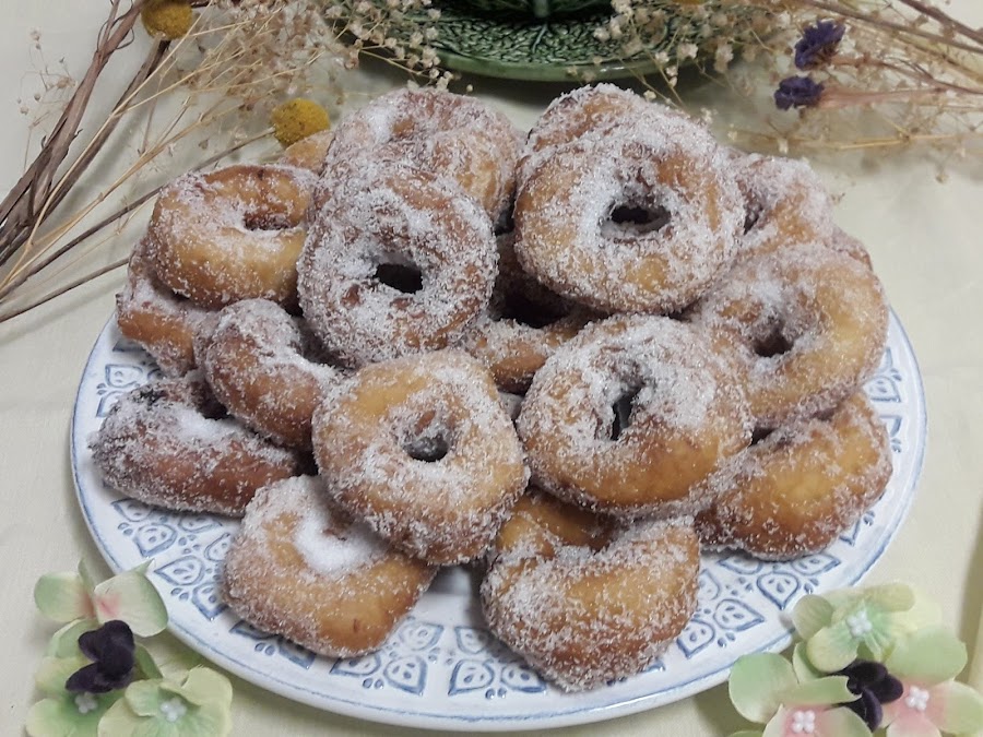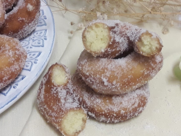 Ponemos una sarten con abundante aceite de girasol a fuego medio sin que llegue a humear y vamos friendo nuestras rosquillas, cuando estén doraditas por ambos lados, las vamos colocando sobre papel de cocina absorbente para eliminar el exceso de aceite y seguidamente rebozamos con el azúcar. Así hasta terminar con toda la masa.