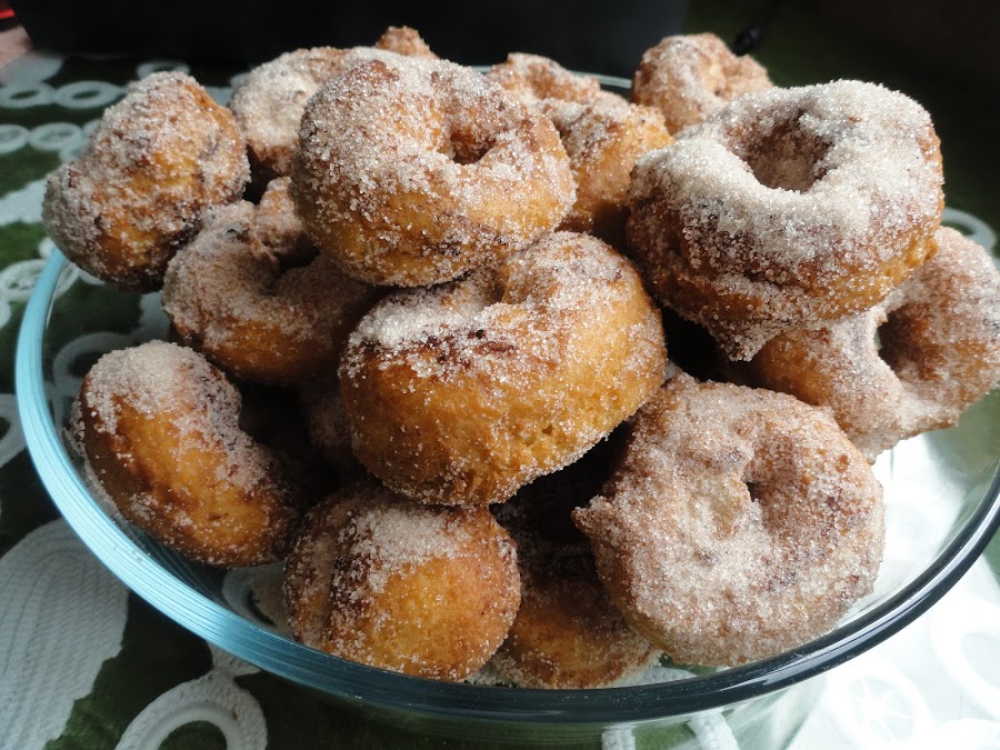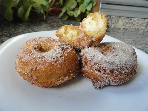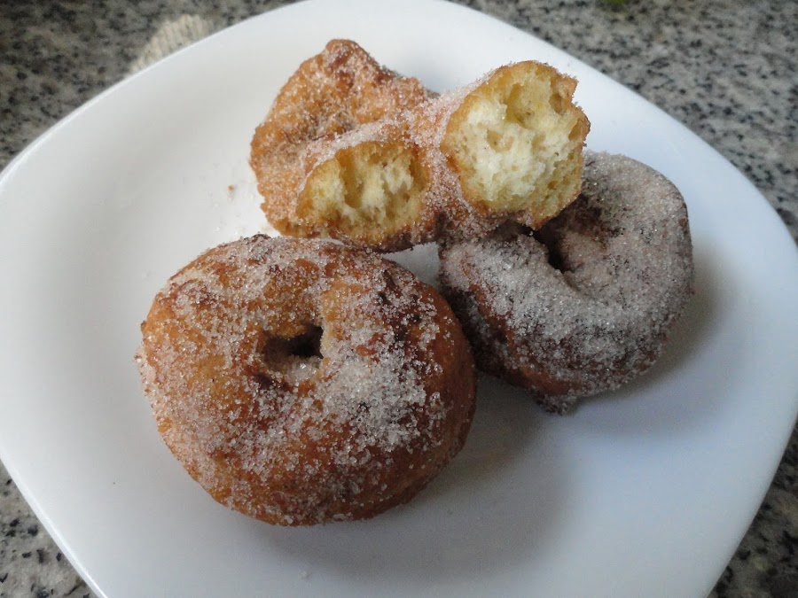 En otro bol tamizamos la harina con la levadura y la vamos agregando a la mezcla anterior poco a poco, hasta obtener una masa que se despegue de las manos, aunque a mi me quedó un poco "pegajosa", pero no quise agregar mucha harina más para que no quedaran duras. Tapamos la masa con film transparente y lo dejamos en la nevera media hora. Después ponemos aceite a calentar y a mi me gusta echarle una piel de limón al aceite, vamos friendo las rosquillas, las ponemos en un plato con papel absorbente. Aparte ponemos en un plato azúcar con canela molida y vamos pasando las rosquillas. Una vez enfriadas las he guardado en un taper y aguantan tiernas, y están buenissssimas.