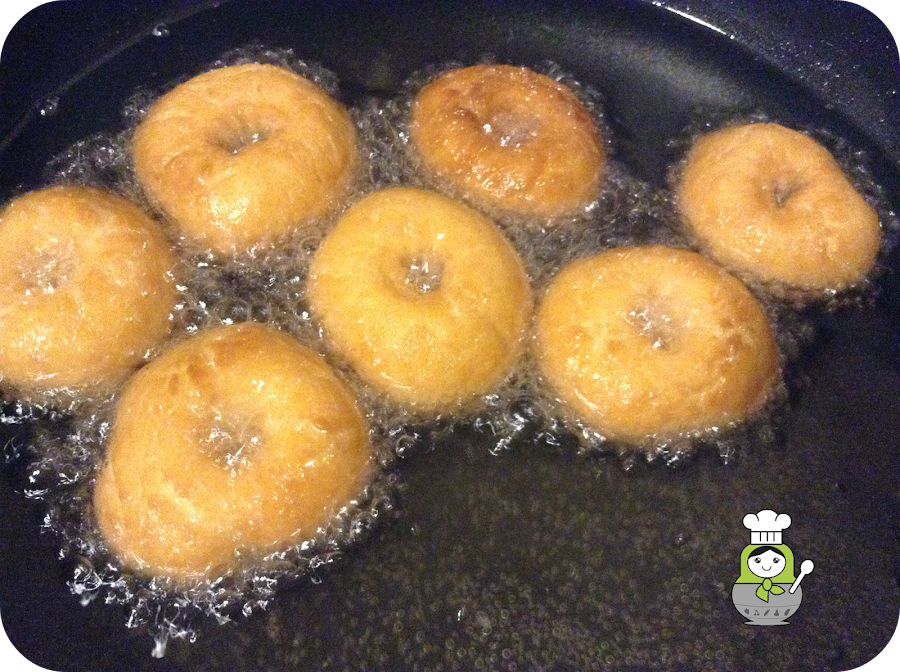 Ponemos una sartén al fuego con abundante aceite y, cuando esté caliente echamos las rosquillas dejando que se doren (tampoco muchísimo) por ambos lados.
