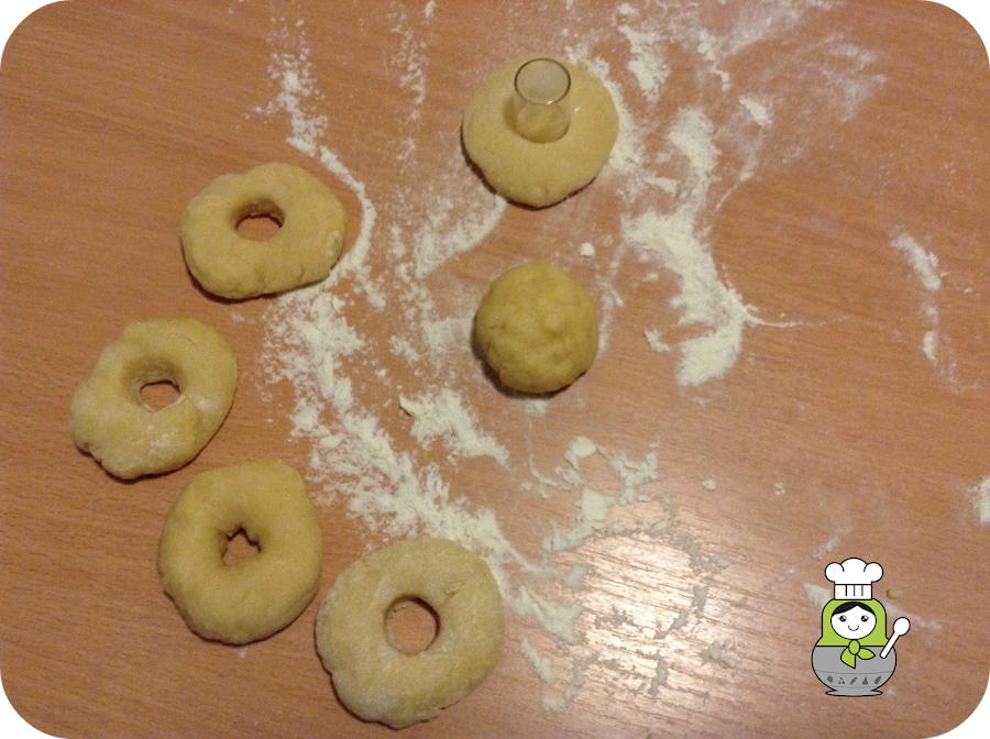 Para formar las rosquillas, vamos cogiendo pequeñas porciones de masa y formando bolitas (más pequeñas que una pelota de ping pong). Las aplastamos con las manos y les hacemos un agujero en el medio con los dedos o con la ayuda de un tapón.