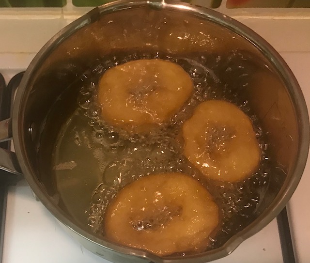Calienta el aceite a en un cazo para freír tus rosquillas ya formadas.