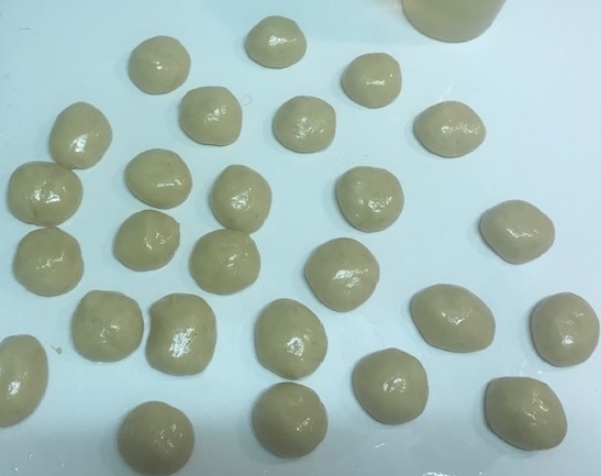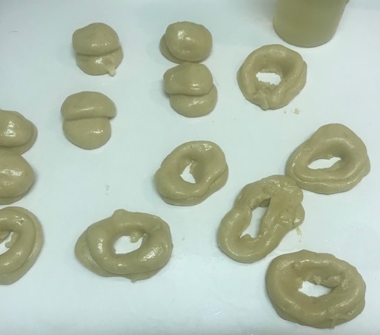 Unta tus manos en aceite y forma bolas (12-15 gramos) une las bolas de dos en dos y presiona en el centro con el dedo para formar las rosquillas.