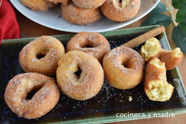 Sacamos a un plato con papel de cocina o a una rejilla para quitar el exceso de aceite y finalmente pasamos por la mezcla de azúcar y canela. Y ya tenemos unas deliciosas rosquillas de flan fáciles y esponjosas.