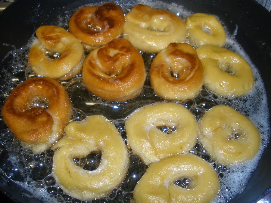 Una vez formada la bola de masa ponemos abundante aceite de girasol a calentar y vamos formando rulos y uniéndolos por los extremos. Que el aceite no esté demasiado caliente porque se os quemarán, vais probando que os saldrán un montón.