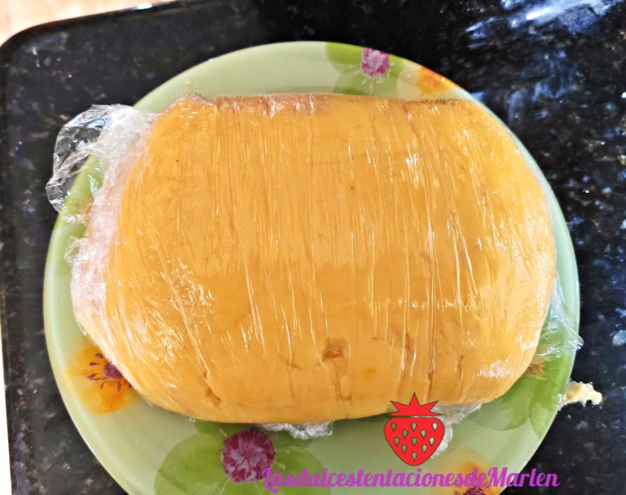 Mezclando hasta que se forme una masa que se despegue bien de las manos. Ve añadiendo cucharadas soperas de harina hasta que la masa esté lisa y uniforme; la envolvemos en papel film y la dejamos reposar en el frigo dos horas.