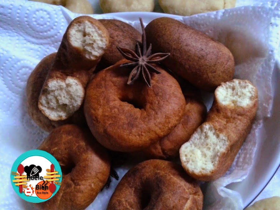 4.- Vertemos abundante aceite en una sartén y añadimos la piel del limón y una estrella de anís. Calentamos sin que llegue a humear y retiramos la cáscara y la estrella. Añadimos las rosquillas y las freímos por tandas, 2 0 3 minutos por cada lado. Vigilando que el aceite no se queme demasiado y evitar que las rosquillas se quemen por fuera y crudas por dentro.
