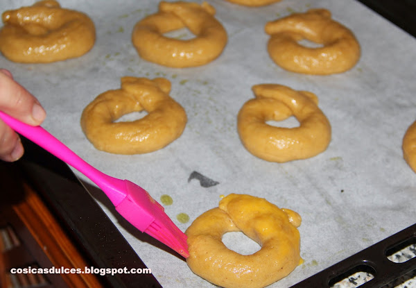 Trabajamos bien hasta obtener una masa lisa que taparemos y dejaremos reposar al menos una hora. Después de ese tiempo tomamos porciones de la masa, formamos las rosquillas, las colocamos sobre una bandeja de horno y pincelamos con huevo batido.