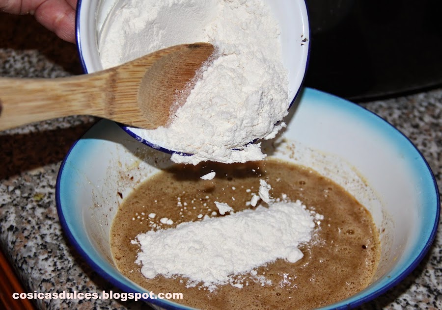 Comenzamos por freir el aceite junto a la cáscara de limón y reservamos hasta que se enfríe. Por otro lado colocamos en un bol el huevo batido, el azúcar, el aceite refrito y ya frío, el bicarbonato, la canela y el zumo de naranja.