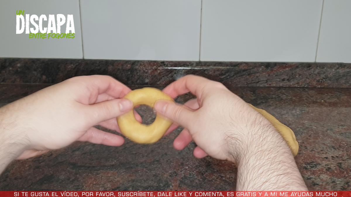 4A continuación procedemos a formar las rosquillas, para ello cogemos un trozo de la masa, le damos forma de bola y le metemos el dedo por el centro para que se haga el agujero, le damos forma de rosquilla y la dejamos en una bandeja de horno. Otra forma de hacer la rosquilla es la siguiente: cogemos un trozo de la masa, la estiramos dándole forma de churro y después unimos los dos extremos.