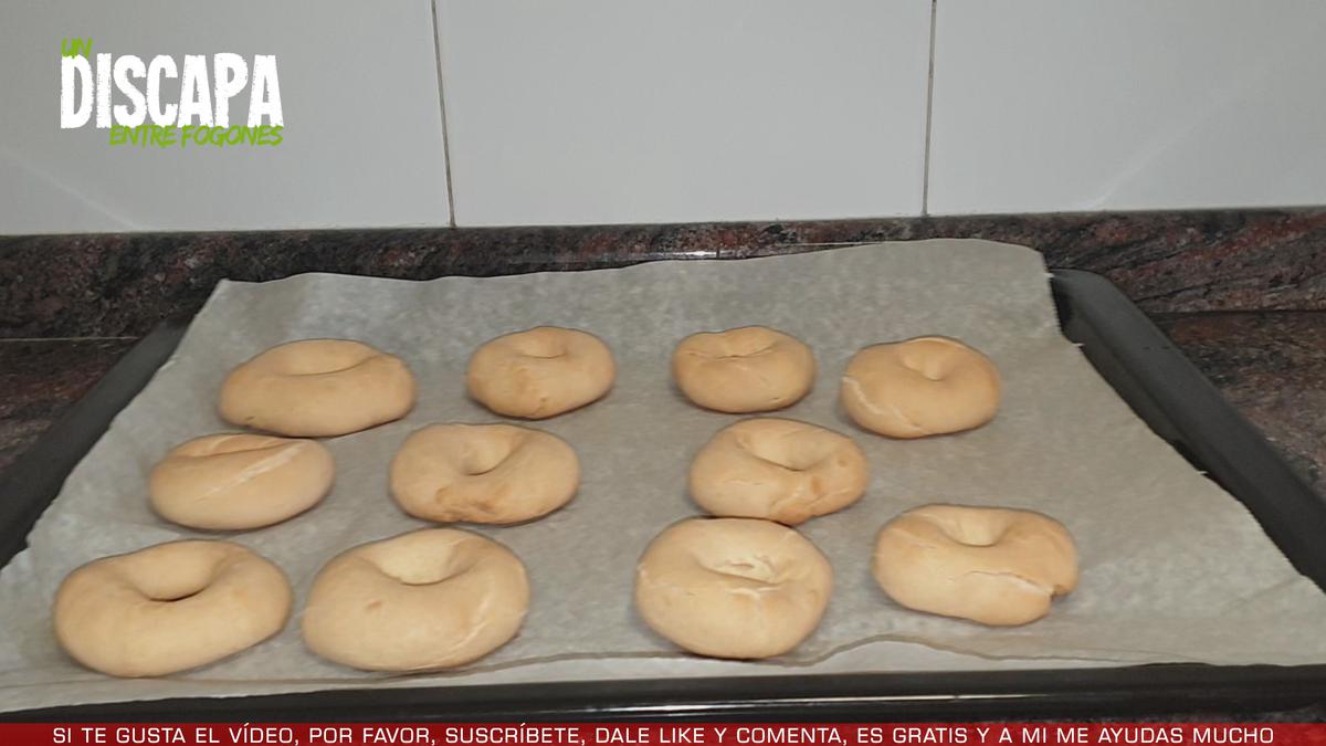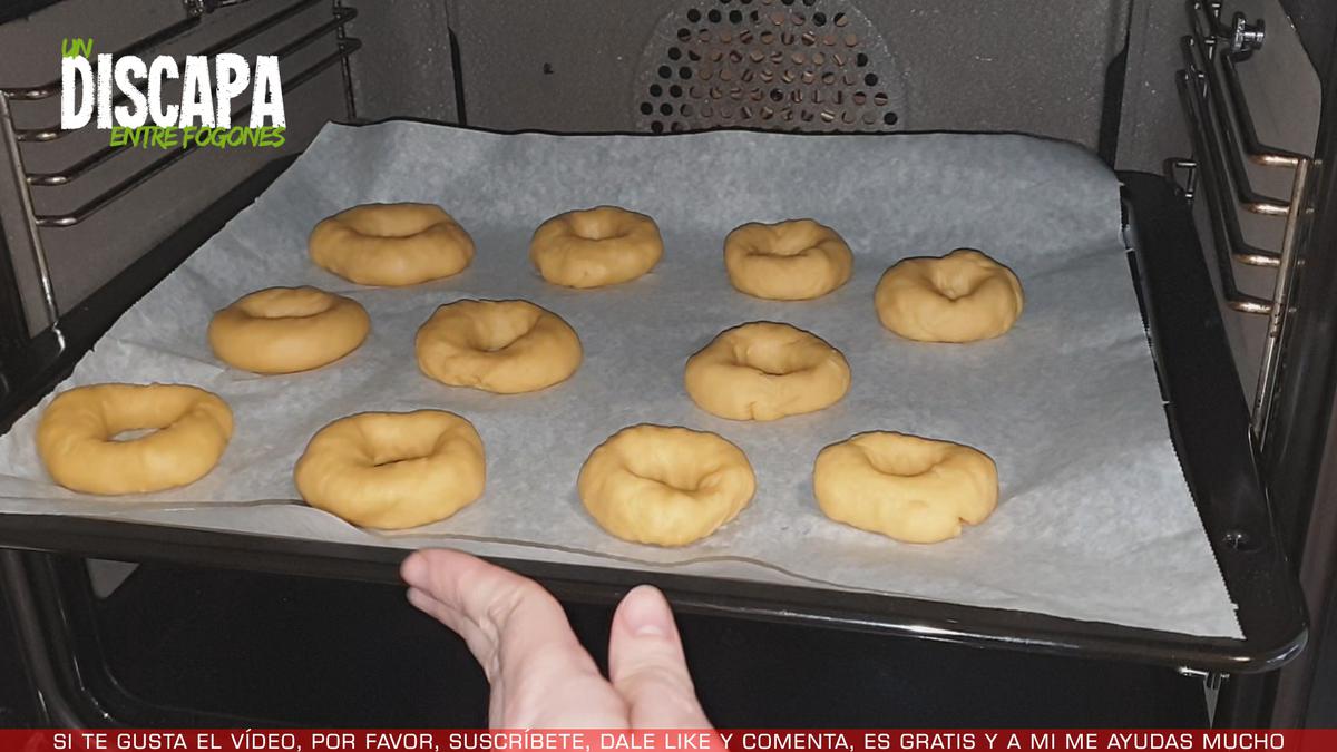 5Precalentamos el horno y metemos las rosquillas a 180º centígrados con calor arriba y abajo durante unos 35 minutos o hasta que veáis que las rosquillas empiezan a coger color.