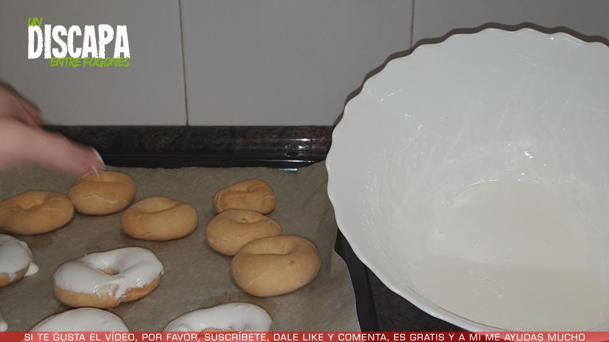9Por último, impregnamos las rosquillas en el glaseado, si queréis podéis sumergir la rosquilla entera en el glaseado, yo solo voy a sumergir la mitad de la rosquilla.